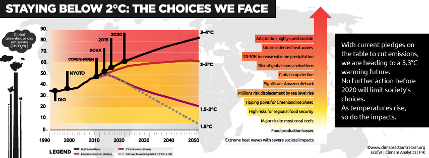 На день позже, чем было запланировано, переговоры ООН по изменению климата в Дохе подошли к концу. Не смотря на то, что во время конференции были представлены новые научные данные об изменении климата, которое грозит приобрести катастрофические масштабы уже в обозримом будущем, правительства так и не смогли достичь серьезных результатов в переговорах. Мир по-прежнему развивается в соответствие со сценарием, включающим потепление на 3-4 градуса Цельсия (см. инфографику), а прошедший год стал рекордным в истории по выбросам парниковых газов.