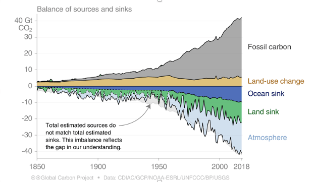 Углеродный бюджет предполагает, что выбросы диоксида углерода производятся за счет изменений в землепользовании (например, за счет пожаров) и сжигания ископаемого топлива для получения энергии и в промышленных процессах. Эти выбросы поглощаются океаном и сушей (например, растениями и деревьями), а оставшиеся (непоглощенные) объемы оказываются в атмосфере.