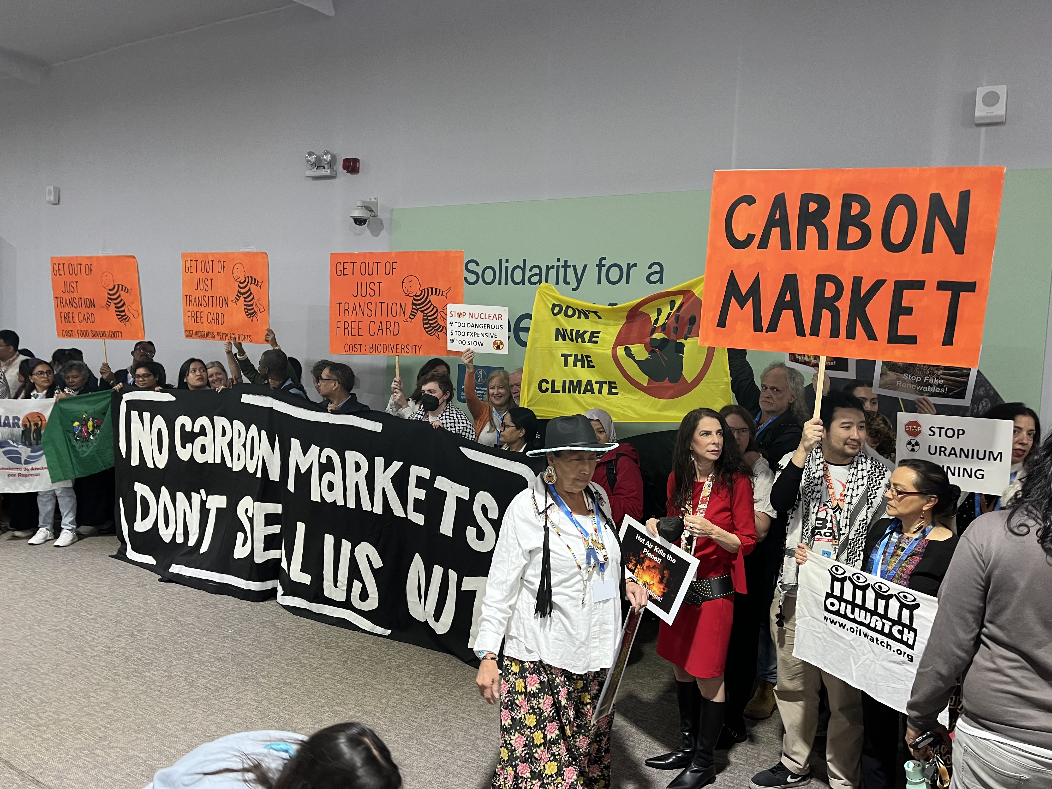В четверг на КОП29 прошла акция неправительственных организаций, критикующих ложные решения для борьбы с изменением климата. Активисты из разных стран мира призывали отказаться от углеродной торговли, которая позволяет «купить право продолжать выбросы». Ранее на КОП29 стороны одобрили механизм статьи 6, закладывающей основу для углеродной торговли. Также в акции приняли участие противники использования атомной энергии для решения проблемы изменения климата.