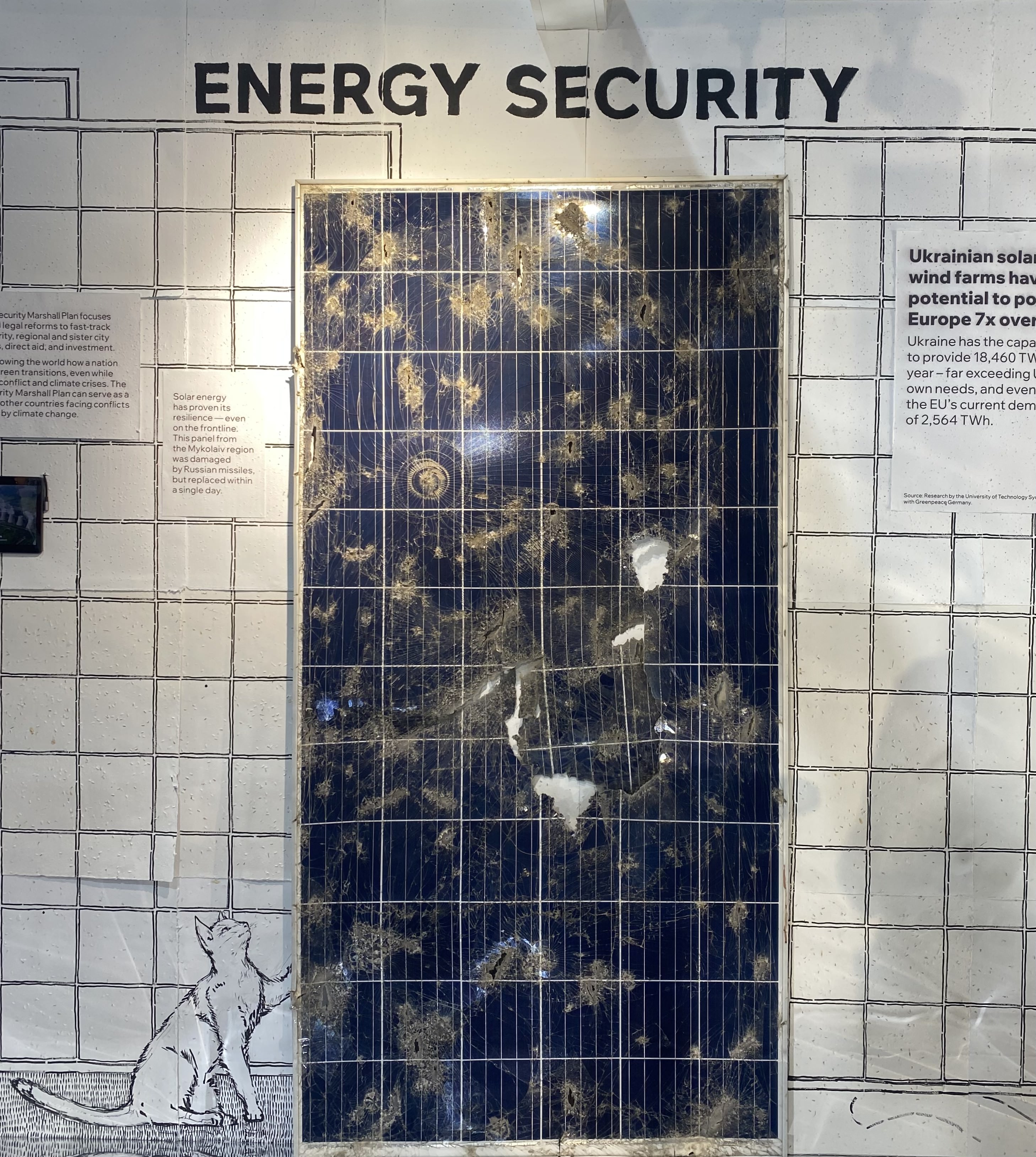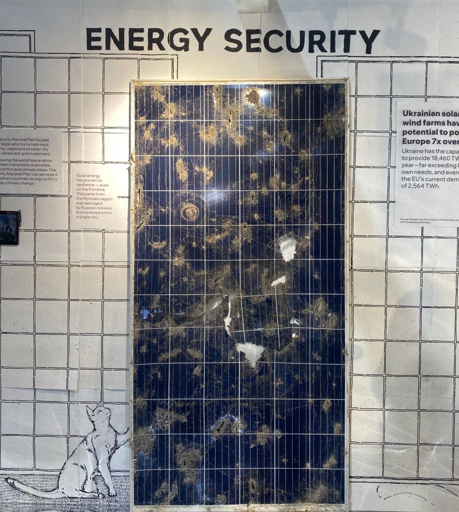 Стены павильона Украины сделаны из переработанного картона с семенами растений. После окончания форума фрагменты этих стен будут посажены в разных частях мира. Это символизирует единство, которое определяет зеленое будущее человечества. На конференцию была привезена солнечная панель из Николаевской области, разрушенная в ходе российских атак. Она была заменена на новую всего за один день, что свидетельствует о более высокой устойчивости возобновляемой энергетики в условиях войны.