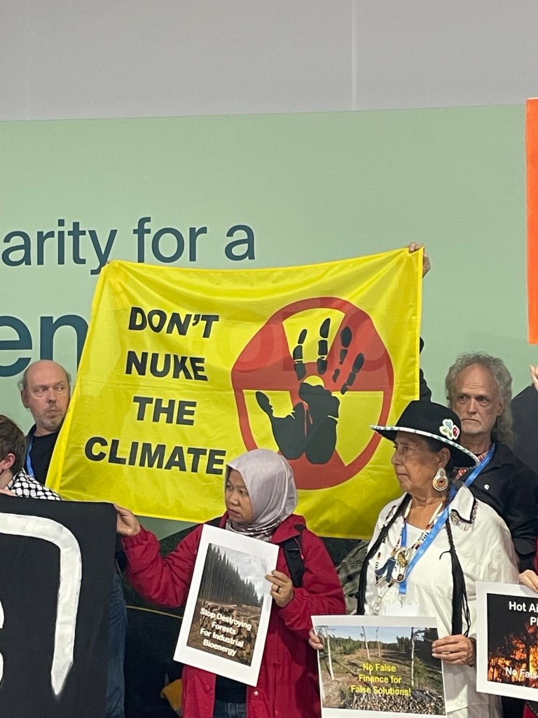 В четверг на КОП29 прошла акция неправительственных организаций, критикующих ложные решения для борьбы с изменением климата. Активисты из разных стран мира призывали отказаться от углеродной торговли, которая позволяет «купить право продолжать выбросы». Ранее на КОП29 стороны одобрили  механизм статьи 6, закладывающей основу для углеродной торговли. Также в акции приняли участие противники использования атомной энергии для решения проблемы изменения климата.