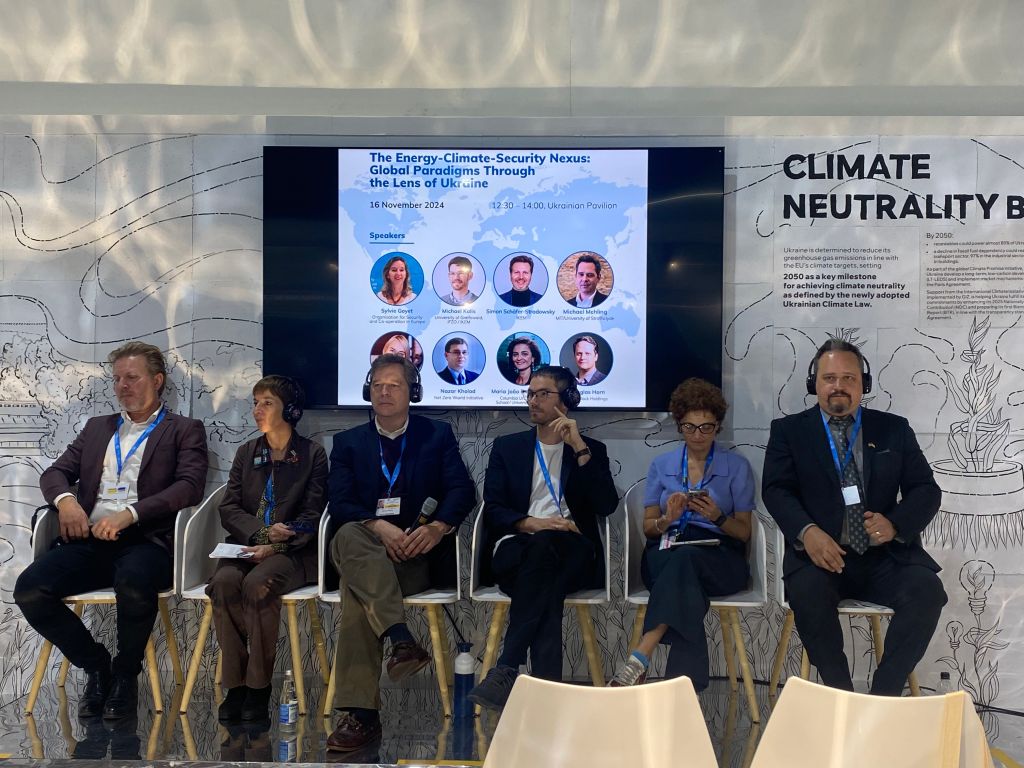 В павильоне Украины на КОП29 прошло мероприятие, посвященное связи энергетики, климата и безопасности. Участники обсудили, как возобновляемая энергетика может способствовать снижению геополитических рисков, как война повлияла на глобальные рынки энергии и как Украина восстанавливает и развивает свою энергосистему во время войны.